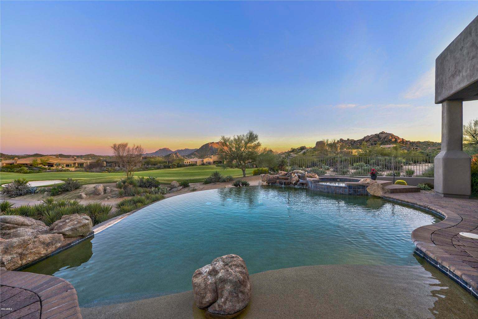 Gorgeous golf property located on the 14th hole of Troon North Monument course, within the prestigious gated community of Pinnacle Canyon. Stunning panoramic mountain views capture both the sunrise over Four Peaks to the east and sunset over Troon Mountain to the west. With an oversized pocket door that opens to the exterior living space, you'll have the ultimate in indoor /outdoor living. The open floor plan creates a spacious and inviting atmosphere, with a dual sided LED fireplace to warm both the living room and dining area. The remodeled large chef's kitchen features an abundance of cabinetry and top-of-the-line Thermador appliances. Luxury amenities include a climate-controlled wine cellar and theater room with 130-inch screen. New tile and PVC 80 mil vinyl roof.