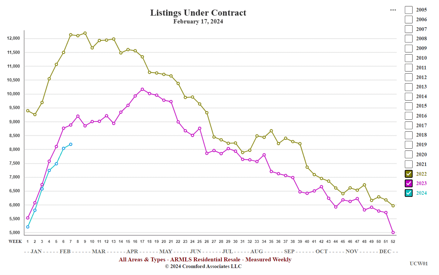 Listing under contract counts continue to be underwhelming, only reaching 8,182 after 7 weeks of the year. The same time last year we had 8,877 and 12,131 the year before.