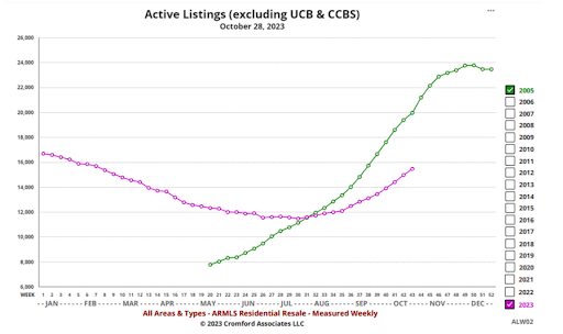 Active listing counts are rising at the second fastest rate we have ever witnessed for late October. Since the low point of 11,473 (excluding UCB and CCBS) in late July they have climbed almost 35% and are rapidly approaching 16,000. The only year which saw a faster rate was 2005: